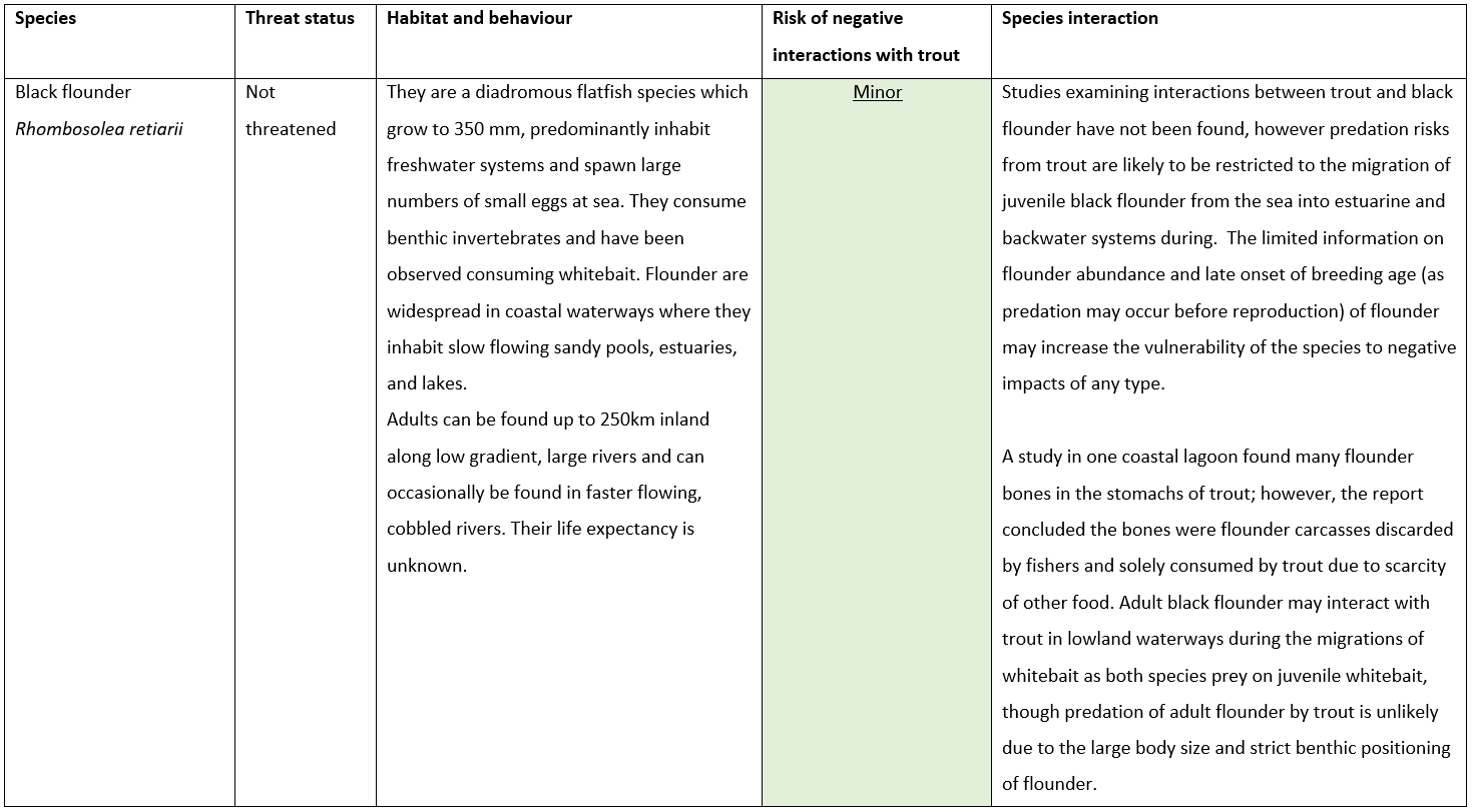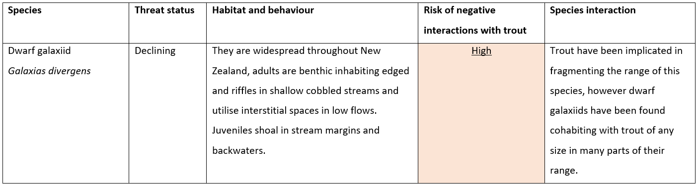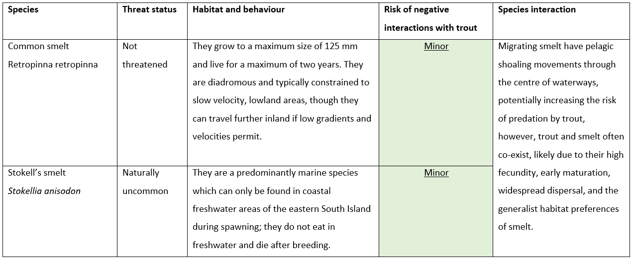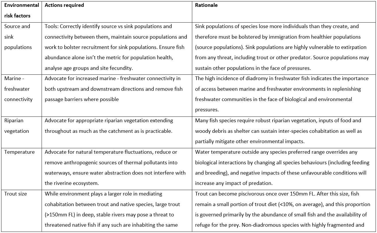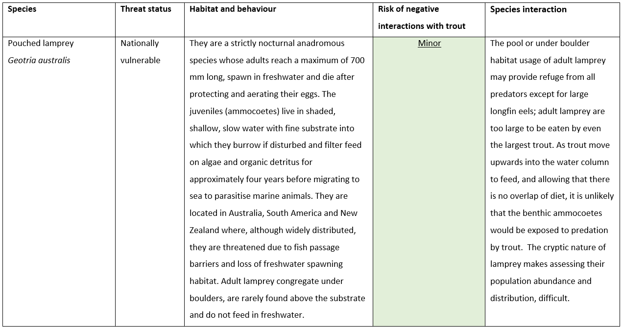 Where species are at a minor risk of negative population level impacts from trout predation, efforts to protect and enhance their habitat should still be encouraged, as this will ensure biological interactions remain low risk.