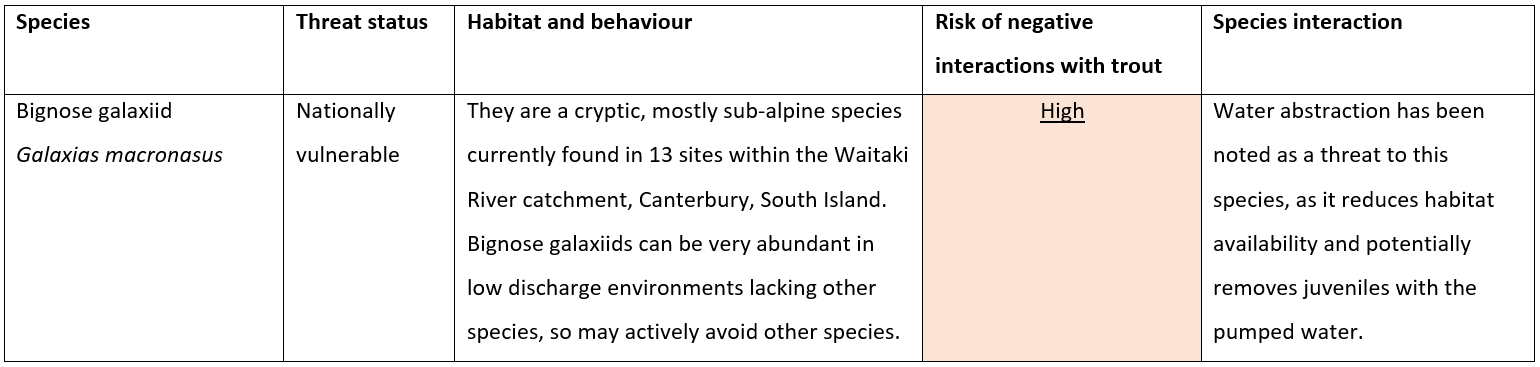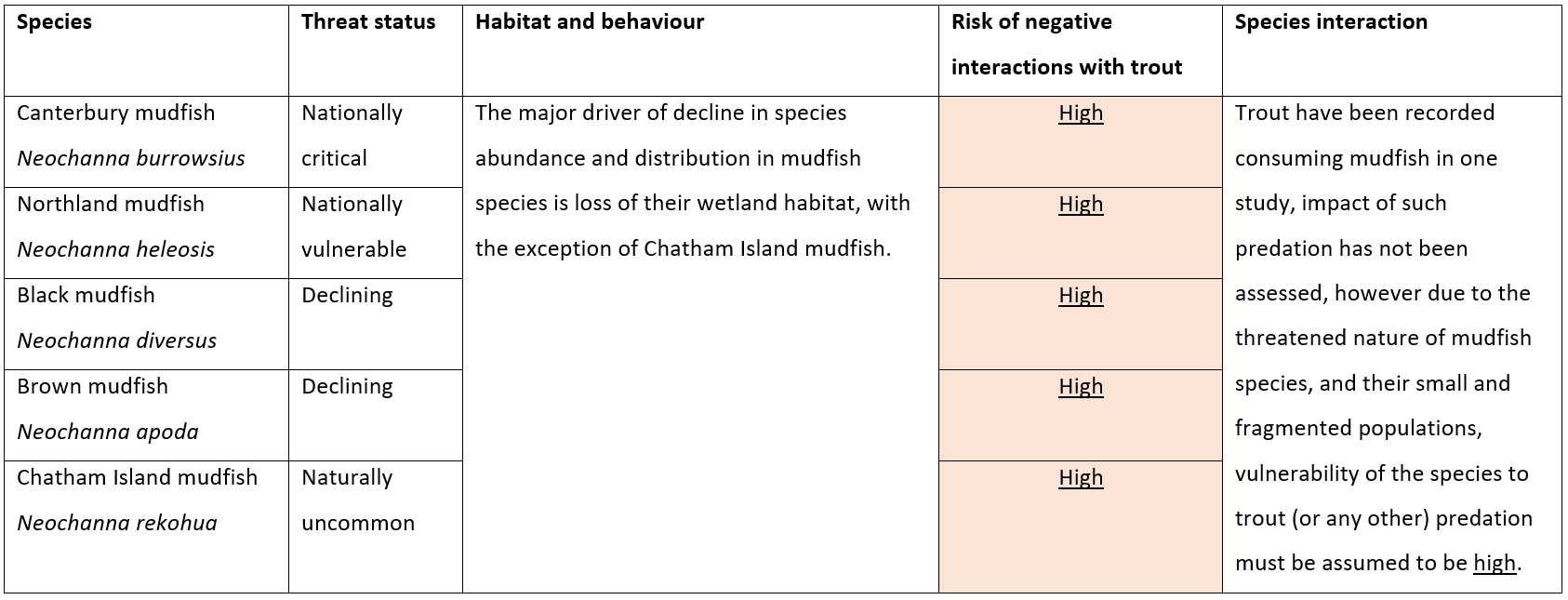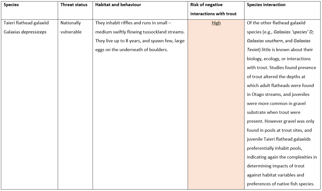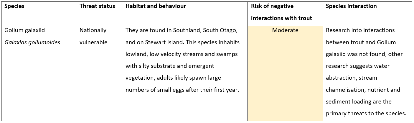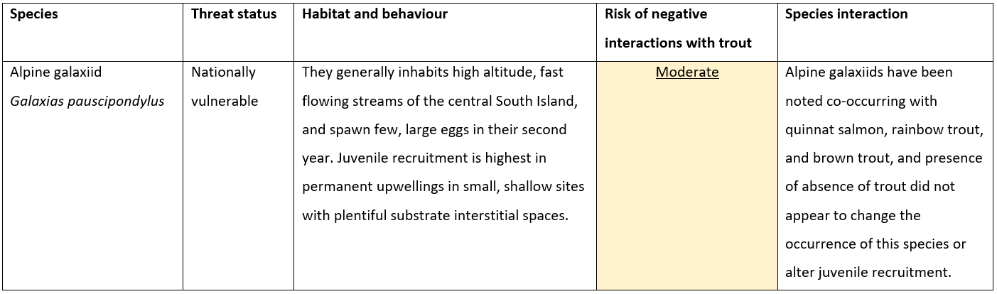 Where species are at a minor risk of negative population level impacts from trout predation, efforts to protect and enhance their habitat should still be encouraged, as this will ensure biological interactions remain low risk.