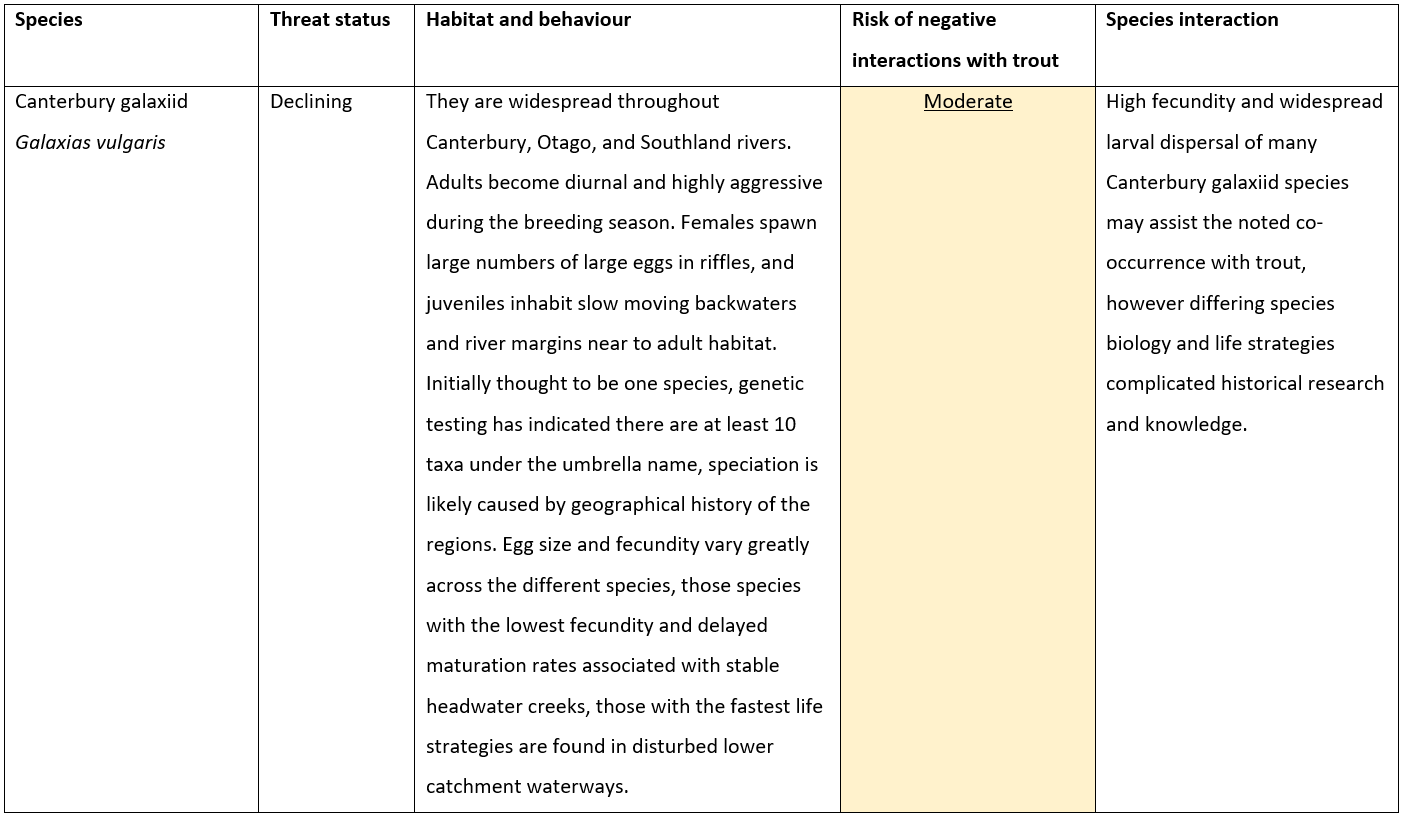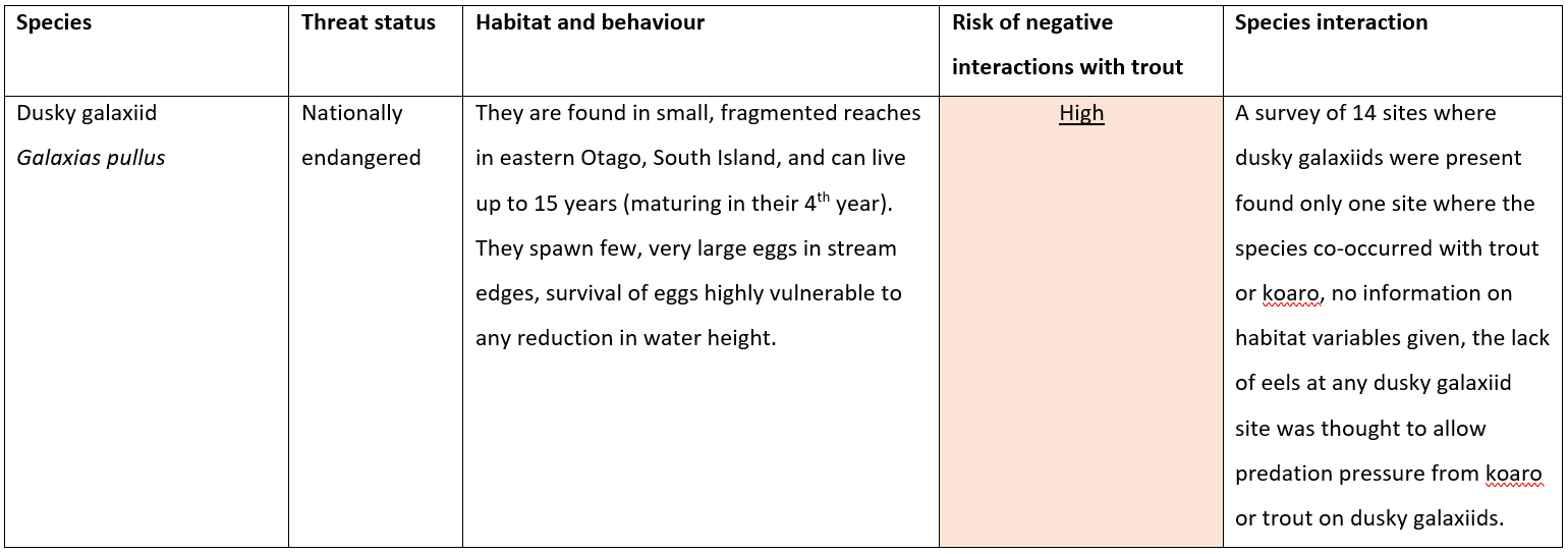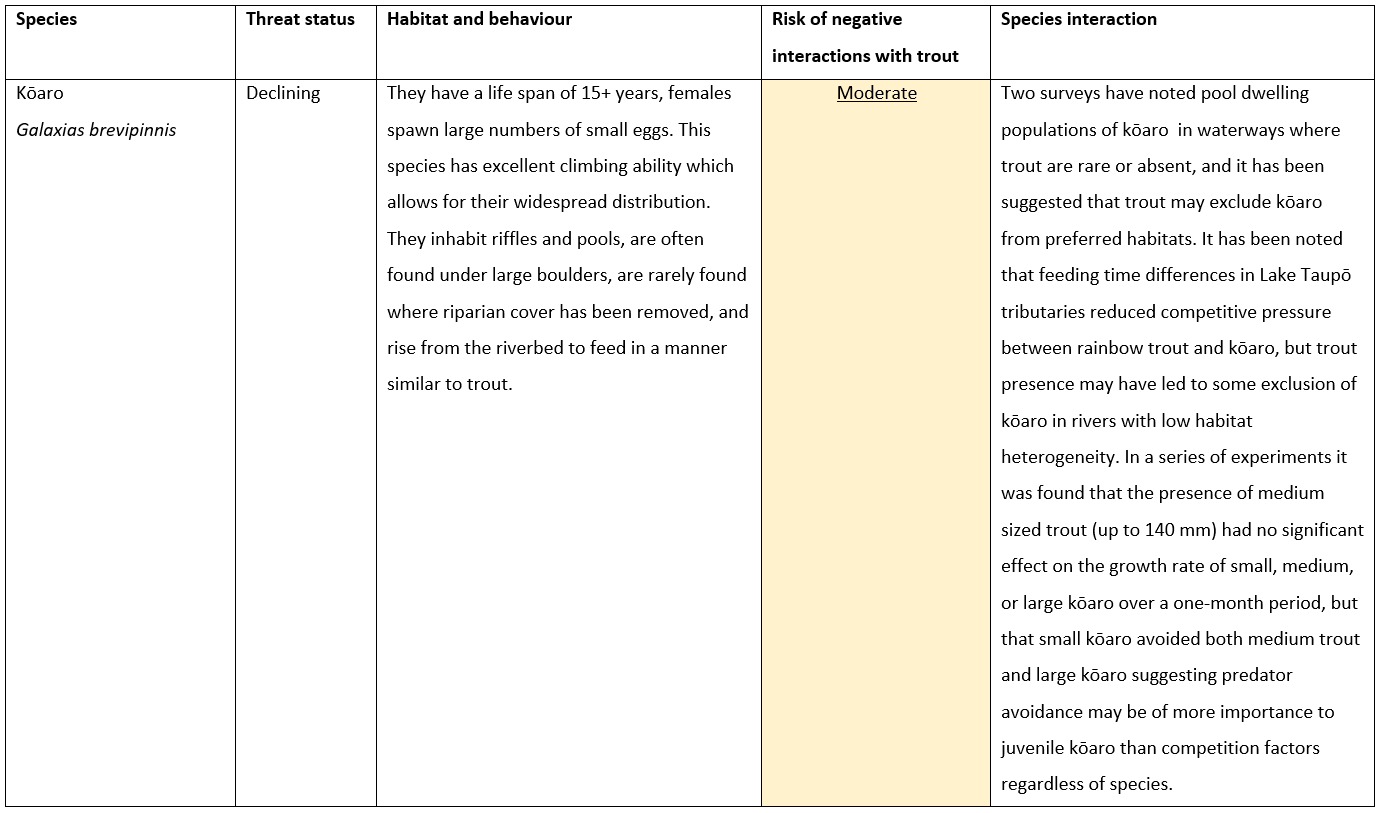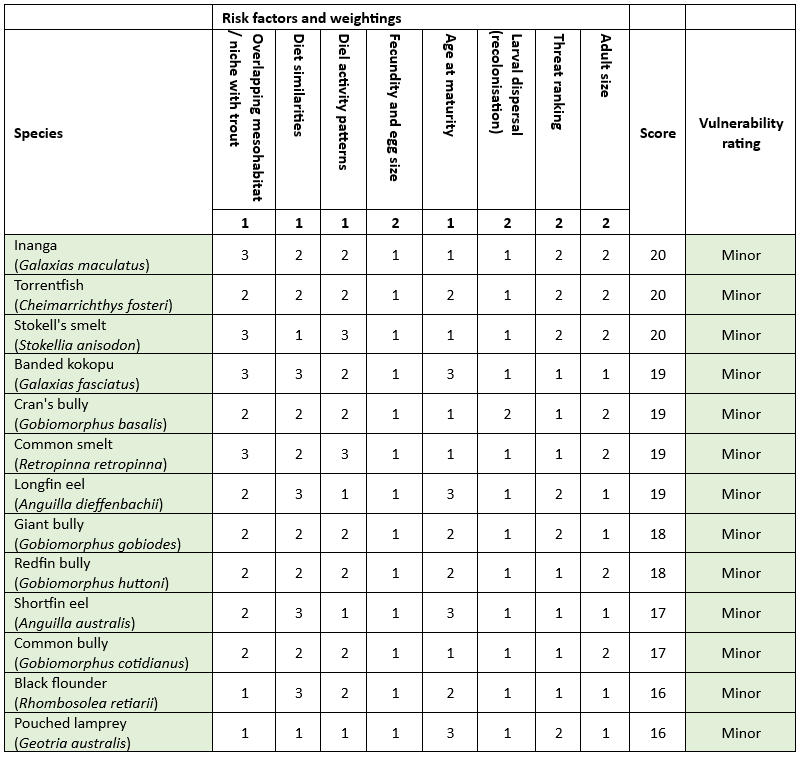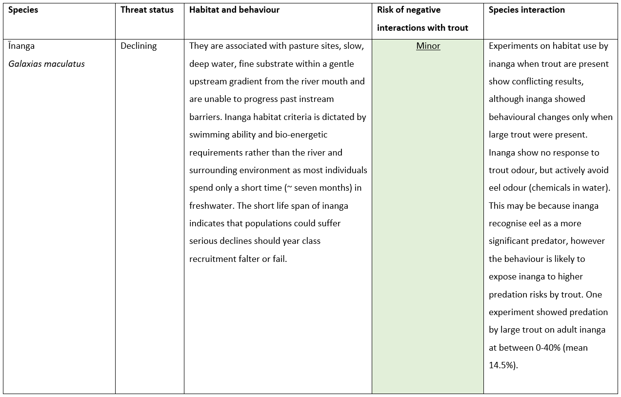 Using the RAM, it is considered the risk of negative interactions with trout to be harmful to inanga and banded kokopu populations is minor, and shortjaw kokopu, giant kokopu and kōaro populations is moderate.