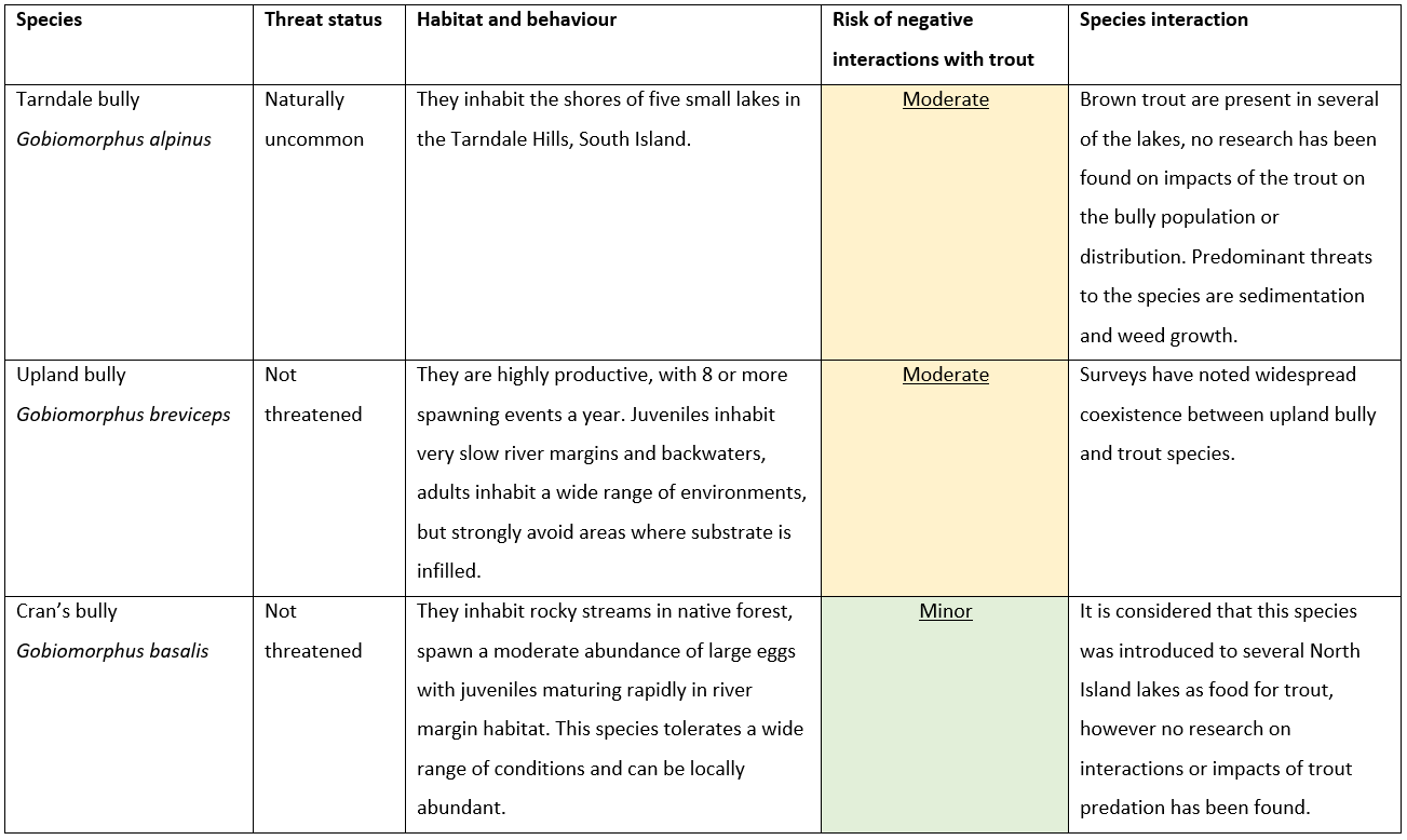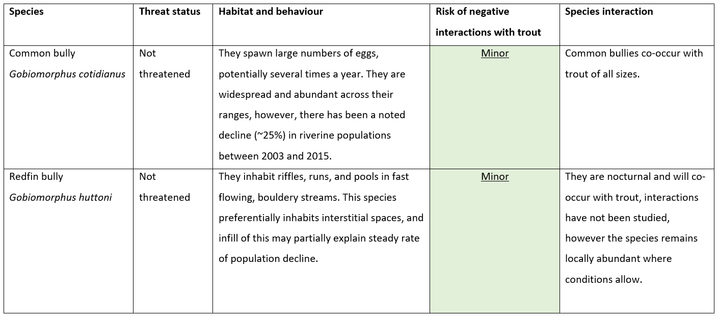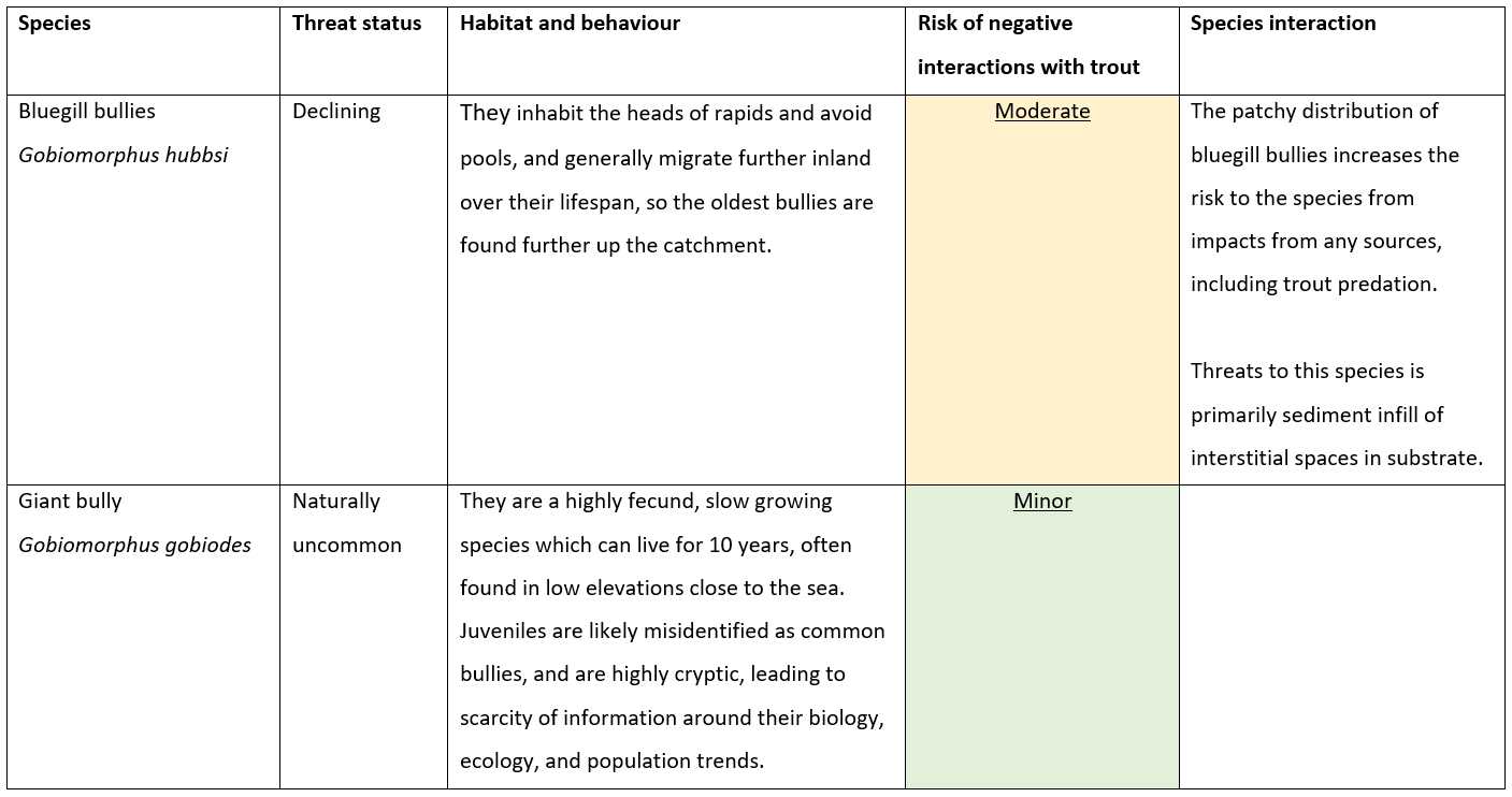 The RAM considers the risk of trout predation to be deleterious to Cran’s bully populations to be minor, and for upland and Tarndale bully populations to be moderate. All species have been noted to co-occur with trout, however upland and Tarndale bullies are geographically isolated with fewer recruitment opportunities, and thus more vulnerable to any negative impacts.