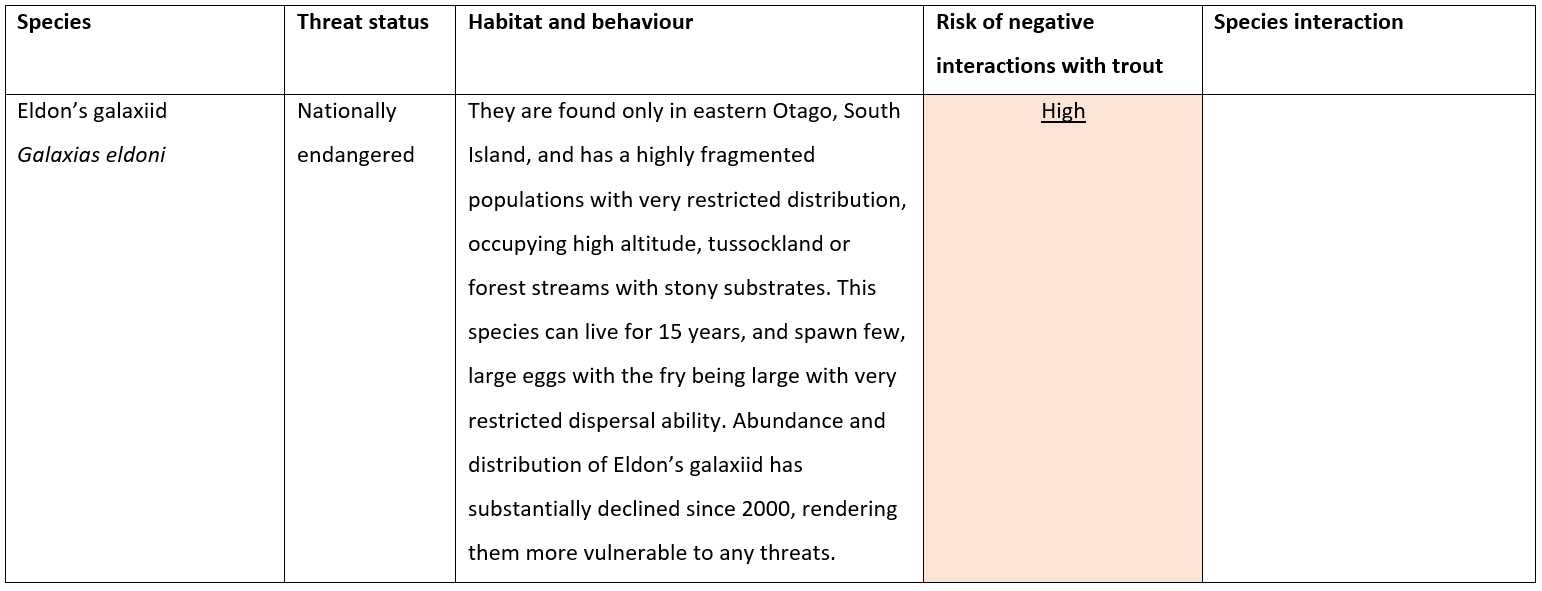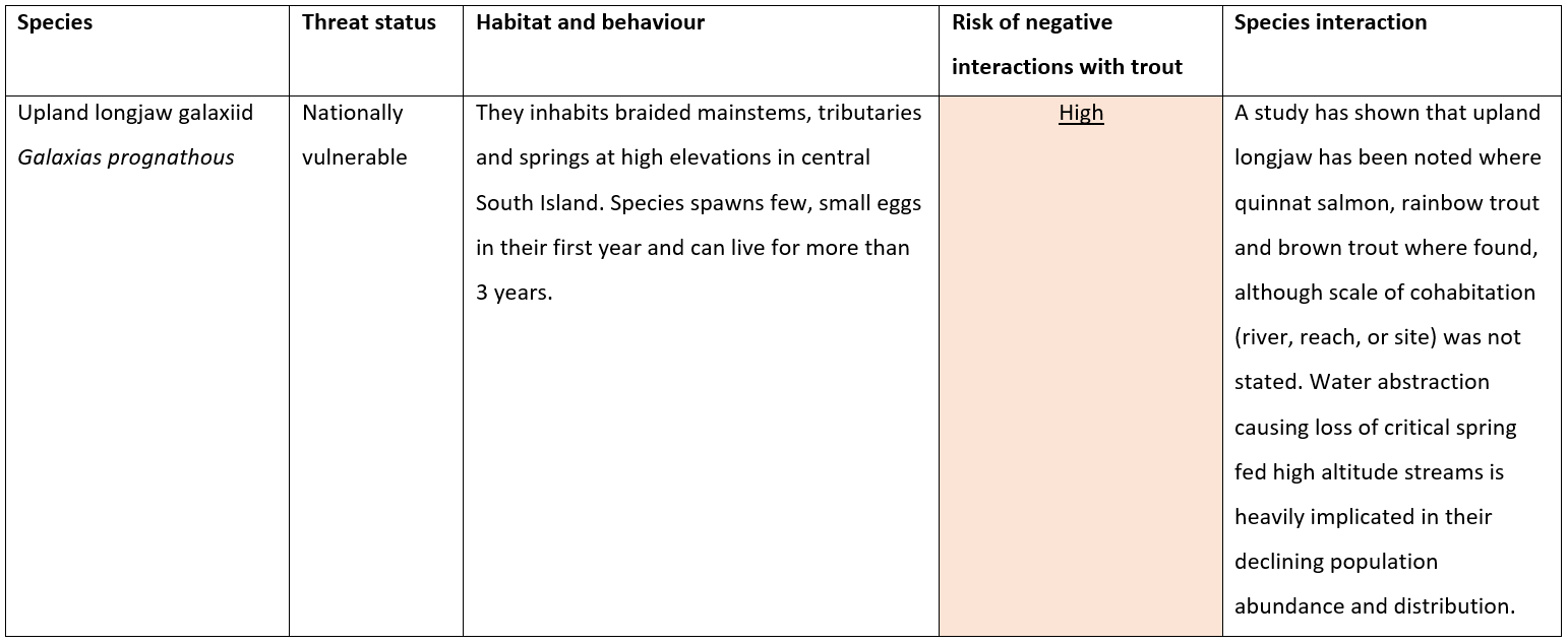 If trout and galaxiid species are found to interact within the same freshwater body, the precautionary principle should be used where species are highly threatened, fragmented, or have slow life strategies and late maturation which can lead to unrecoverable population impacts by any means (predation by fish or birds, or loss of habitat).