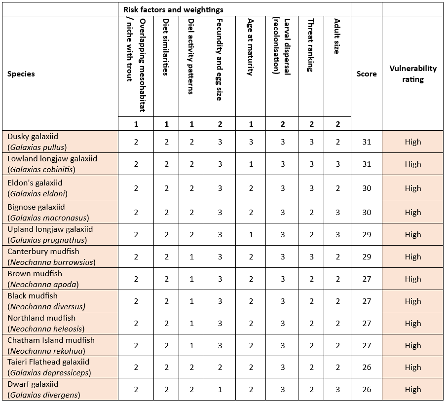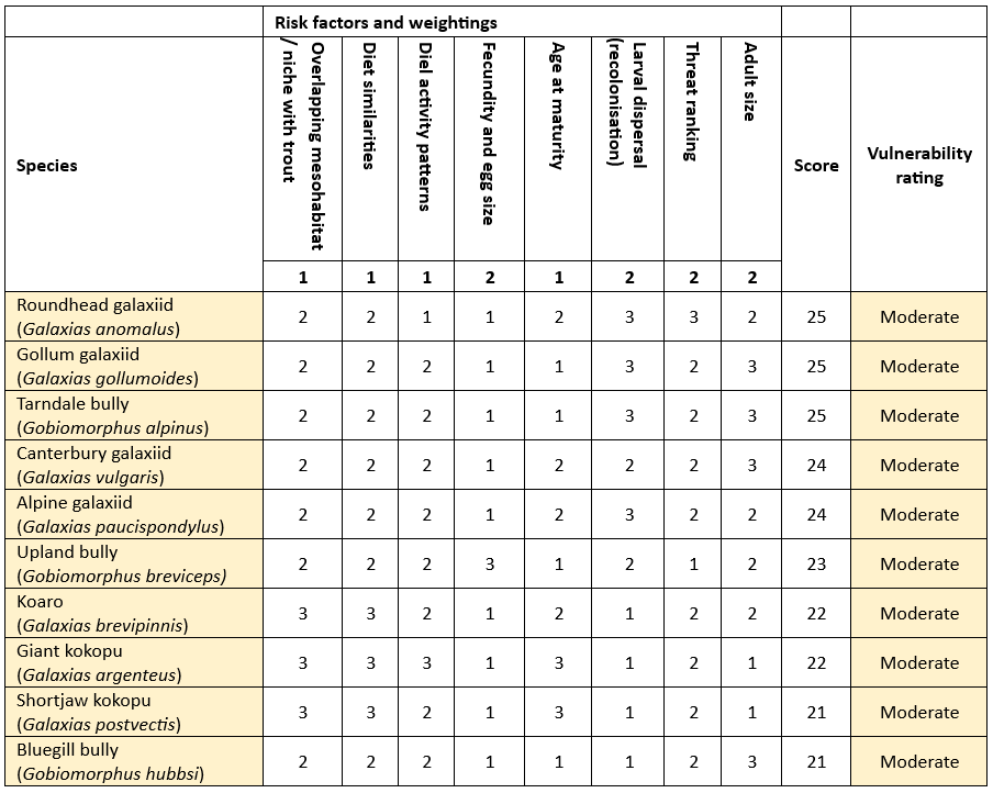 This RAM gives an objectively derived numeric score for each species based on an assessment of specific traits. The impact trout predation has on the population of each native species depends on frequency and extent of interactions with trout, population dynamics, and behaviour. Literature on species life history (how rapidly species re-populate), biology, and ecology information were used to populate this RAM. Certain risk factors were seen as more likely to cause species to be more vulnerable than others, and these were given a weighting to show this. The scores derived from this information where then grouped into highly vulnerable, moderate, and minor risk groups. This ranking shows how vulnerable each species is likely to be to population level detrimental impacts of trout predation. Those threatened, fragmented, species are highly vulnerable to extinction or extirpation from any source and need to be protected from all threats. Where adults of a species remain small, they are more likely to be able to be eaten by trout or a larger fish. Species with a slow life strategy (spawning few, large, eggs, having a low dispersion rate of individuals or breeding maturity reached after many years) are more vulnerable to losses which contribute to smaller, fragmented, or less resilient populations. Species which mature quickly, spawn many small and mobile young, and/or disperse widely, tend to have populations which are more resilient to threats, including that of predation by trout.