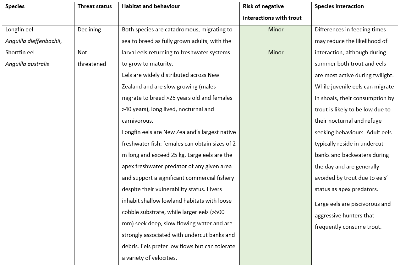 Using the RAM, it is considered the risk of negative interactions with trout in causing harm to either eel populations is minor.