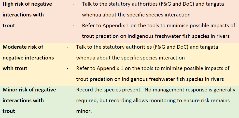 Appendix 1 provides tools to help mitigate possible trout predation impacts on indigenous freshwater species. The strategies outlined in Appendix 1 are anticipated to help reduce their level of risk in the ecosystem and lower their status as a threatened species. All species will require monitoring, but the tools set out in Appendix 1 provide direction on how to respond to identified negative species interaction.